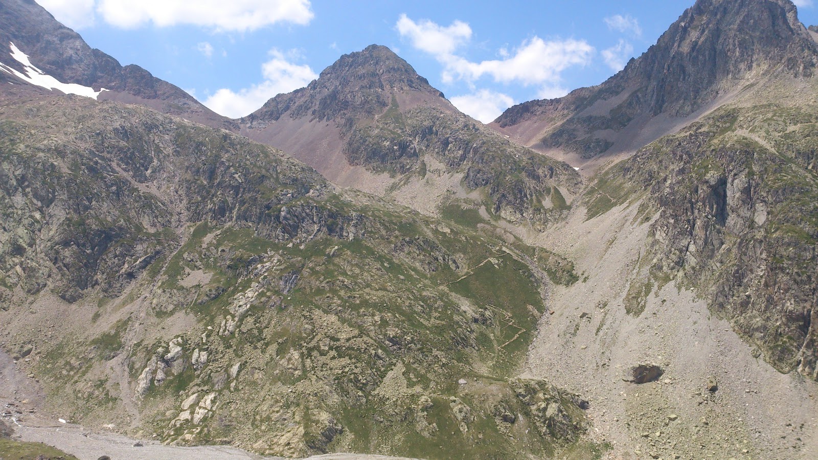 Pocas carreras en esta bajada, el sendero discurre mayormente entre pedruscos, neveros y arroyos que debemos saltar. No importa, mientras bajamos no dejamos de mirar las paredes norte de la montaña, señalo a mis colegas el Colouir de Gaube, ese corredor blanco que asciende desde la base de la montaña hasta arriba, una vía clásica de los Pirineos para escaladores de nivel y con un par de... piolets.