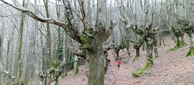 El recorrido de la carrera nos llevará por un bosque de hayas trasmochas y Martin me explica que este tipo de aprovechamiento de los árboles se ha perdido lo que supone el fin para estos árboles. Por ello y con ayudas de los Fondos Europeos, el Gobierno Vasco está trabajando en su recuperación. Es curioso porque en mi Zaragoza natal la gente hizo lo mismo con los chopos: Los chopos cabeceros que se explotaban igual que las hayas, obteniendo madera periódicamente sin cortar el árbol.